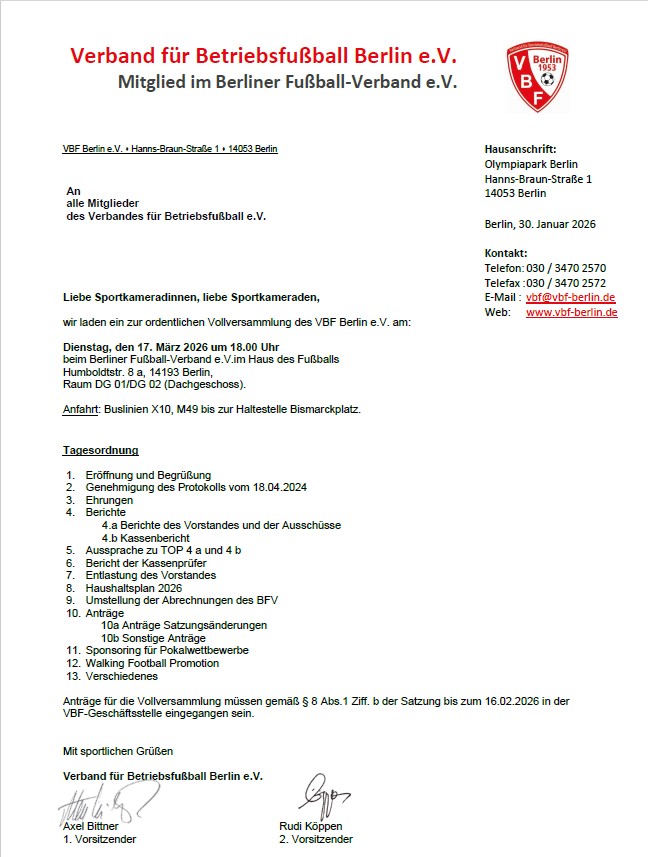 Die Vollversammlung des VBF findet in diesem Jahr am Dienstag, den 17. März 2026, um 18.00 Uhr, im Haus des Fußballs, Humboldtstr. 8a, 14193 Berlin Raum DG 01/DG 02 statt.