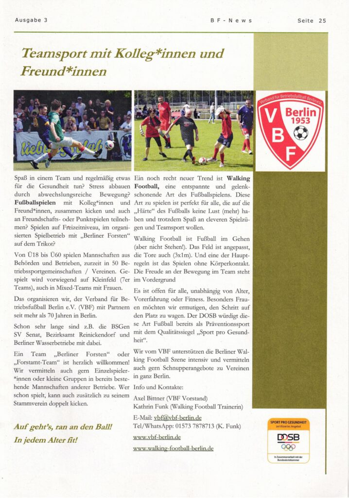 In der Ausgabe 3/2025 der Berliner Forsten, „BF-News“ sind Informationen über den durch den VBF organisierten Betriebsfussball in Berlin und über Walking Football als Gesundheitssport veröffentlicht worden.